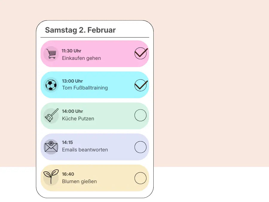 Du kannst Aufgaben pro Person anlegen, wiederholen lassen und abhaken. Ideal für Haushalt, Lernzeiten, Routinen und Wochenpläne – für mehr Klarheit und weniger „Wer macht was?“.